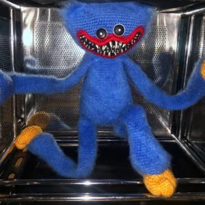 Huggy Wuggy crochet pattern – detailed amigurumi monster toy with big smile and long limbs by Monoxatoys.
