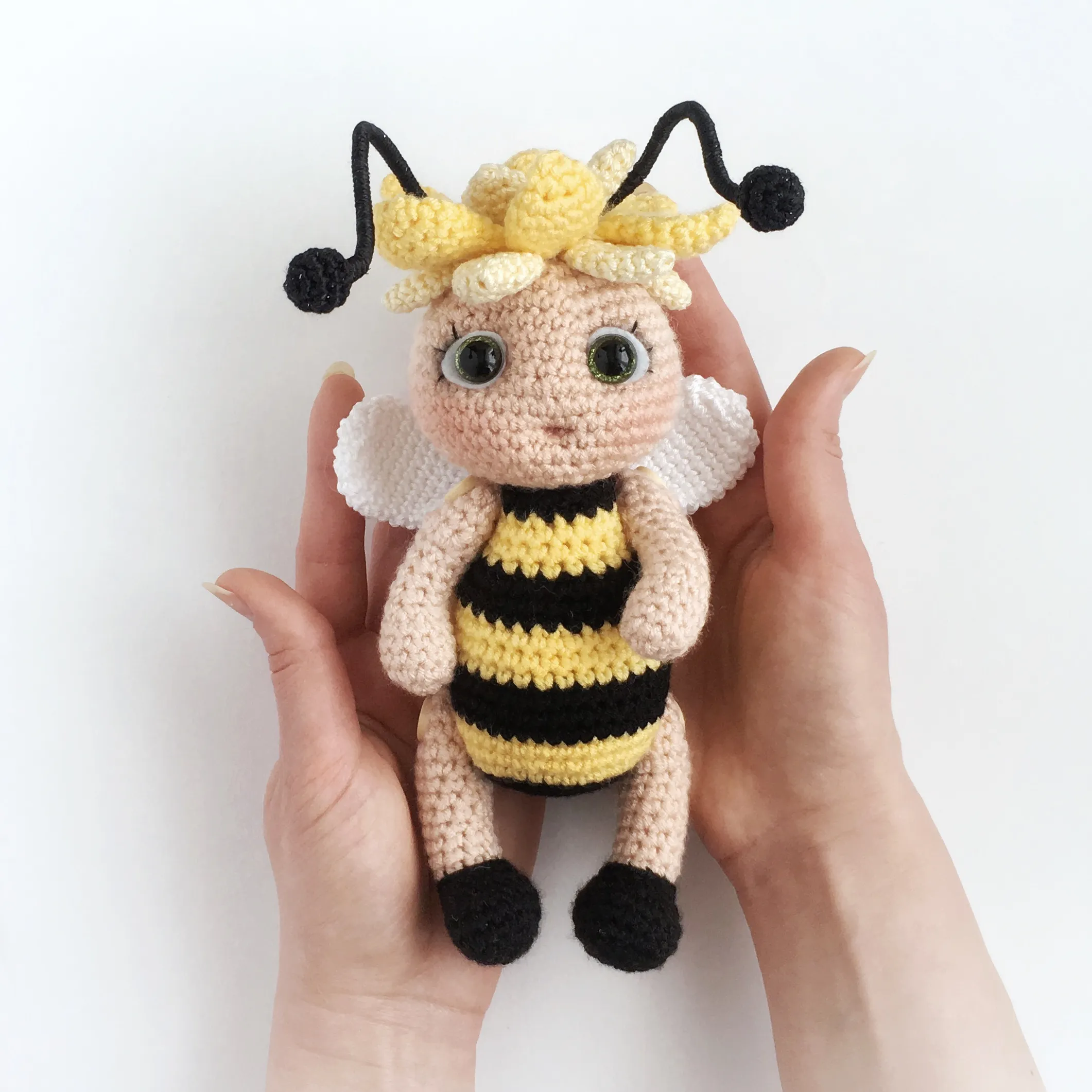 YARN and HOOK: DK weight (8 ply / 11 wpi) yarn (beige, yellow black, and white colors) and a 2,50 – 3,50 mm crochet HOOK (US size 1/B – 3/D) or according to the yarn.