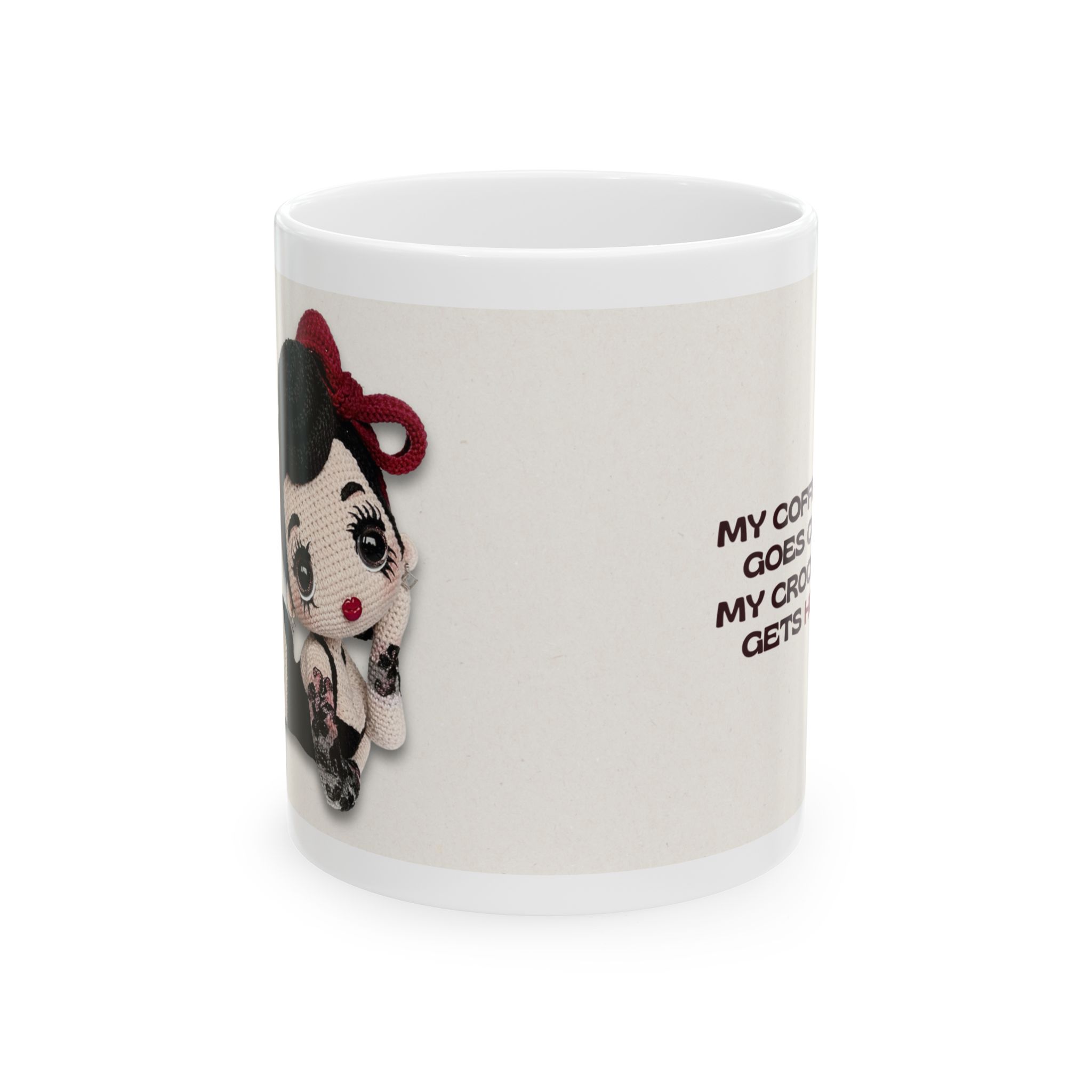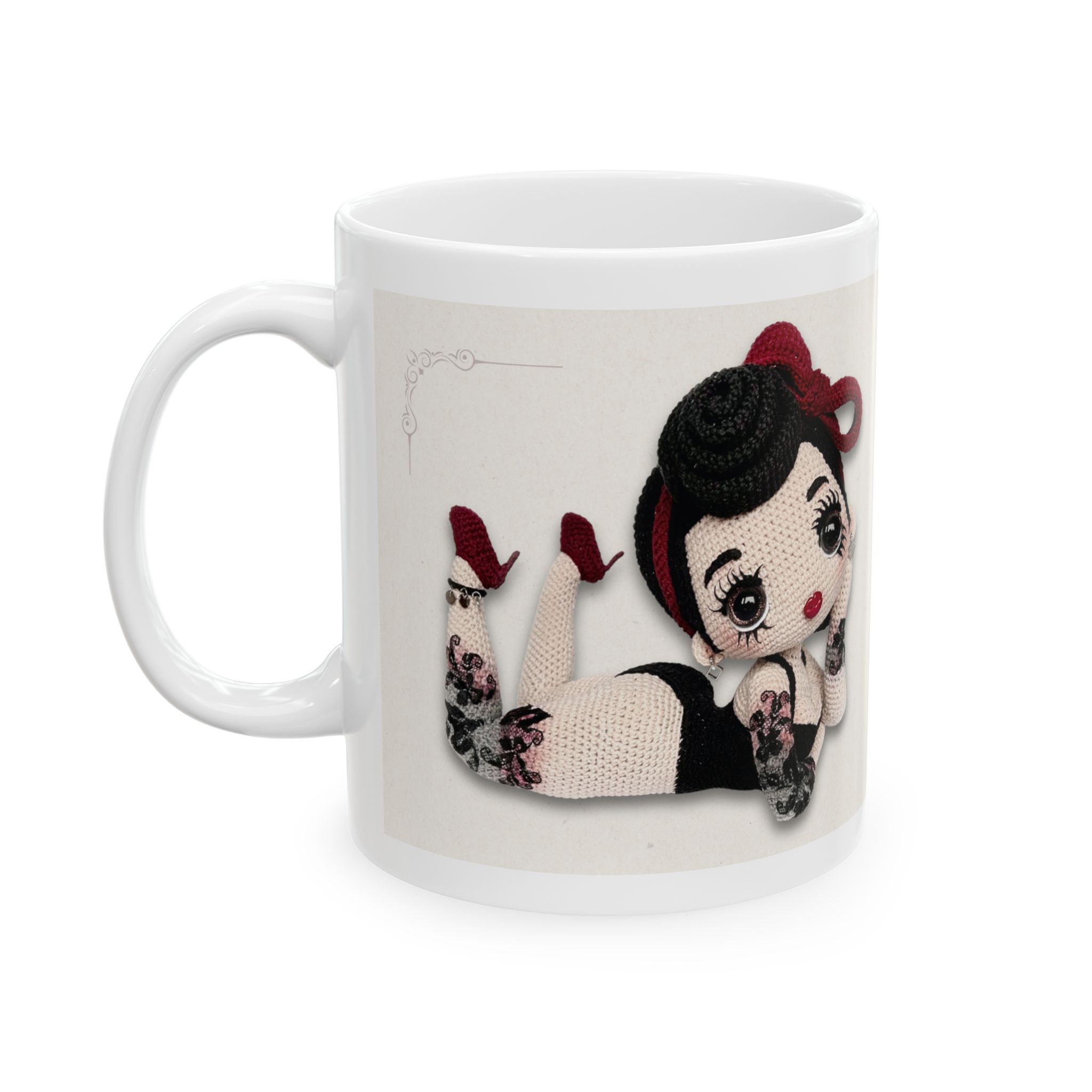 I designed this limited-edition ceramic mug with my Tattooed Pin-Up Doll illustration, combining vintage pin-up glamour with handcrafted crochet artistry and attitude. It’s a thoughtful gift for advanced amigurumi lovers.